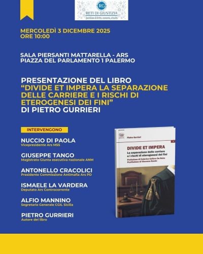 In scena la "prima" siciliana di un largo e composito schieramento del "NO" alla riforma Meloni - Nordio sulla separazione delle carriere dei magistrati. Occasione, presso la Sala Piersanti Mattarella dell'Assemblea regionale siciliana, la presentazione del volume "Divide et Impera. La separazione delle carriere e i rischi di eterogenesi dei fini" di Pietro Gurrieri.