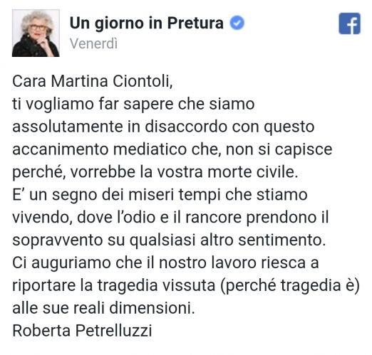 Bufera social su Roberta Petrelluzzi, conduttrice di "Un giorno in pretura". Poco prima dell'ultima puntata della trasmissione, dedicata all'omicidio di Marco Vannini del 15 maggio 2015 - provocato, lo ricordiamo, da un colpo d'arma da fuoco esploso all'interno della villetta della famiglia della sua fidanzata Martina, la conduttrice si è rivolta con un post proprio a Martina: "Cara Martina Ciontoli, ti vogliamo far sapere che siamo assolutamente in disaccordo con questo accanimento mediatico che, non si capisce perché, vorrebbe la vostra morte civile. È un segno dei miseri tempi che stiamo vivendo, dove l'odio e il rancore prendono il sopravvento su qualsiasi altro sentimento. Ci auguriamo che il nostro lavoro riesca a riportare la tragedia vissuta (perché tragedia è) alle sue reali dimensioni. Roberta Petrelluzzi".