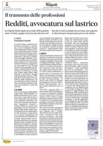 "Cifre rosso sangue quelle che riguardano i suicidi a causa della mancanza di lavoro. Tra loro anche tantissimi professionisti,soprattutto avvocati e commercialisti. Il capoluogo partenopeo, purtroppo, non fa eccezione: a Napoli negli ultimi tempi si sono registrati alcuni tragici episodi. Due avvocati si sono tolti la vita, il primo lanciandosi nel vuoto dal ponte del Virgiliano, il secondo impiccandosi nei bagni nella palazzina che ospitava i giudici di pace di Marano. E sono tante le segnalazioni che si aggiungono: casi ancora tutti da verificare (come quello di un ex penalista che sopravviverebbe, sempre al Vomero, vendendo cianfrusaglie su una bancarella), ma che indicano lo stato di profondo disagio umano ed economico vissuto da tanti avvocati e professionisti finiti nel baratro delle nuove povertà".